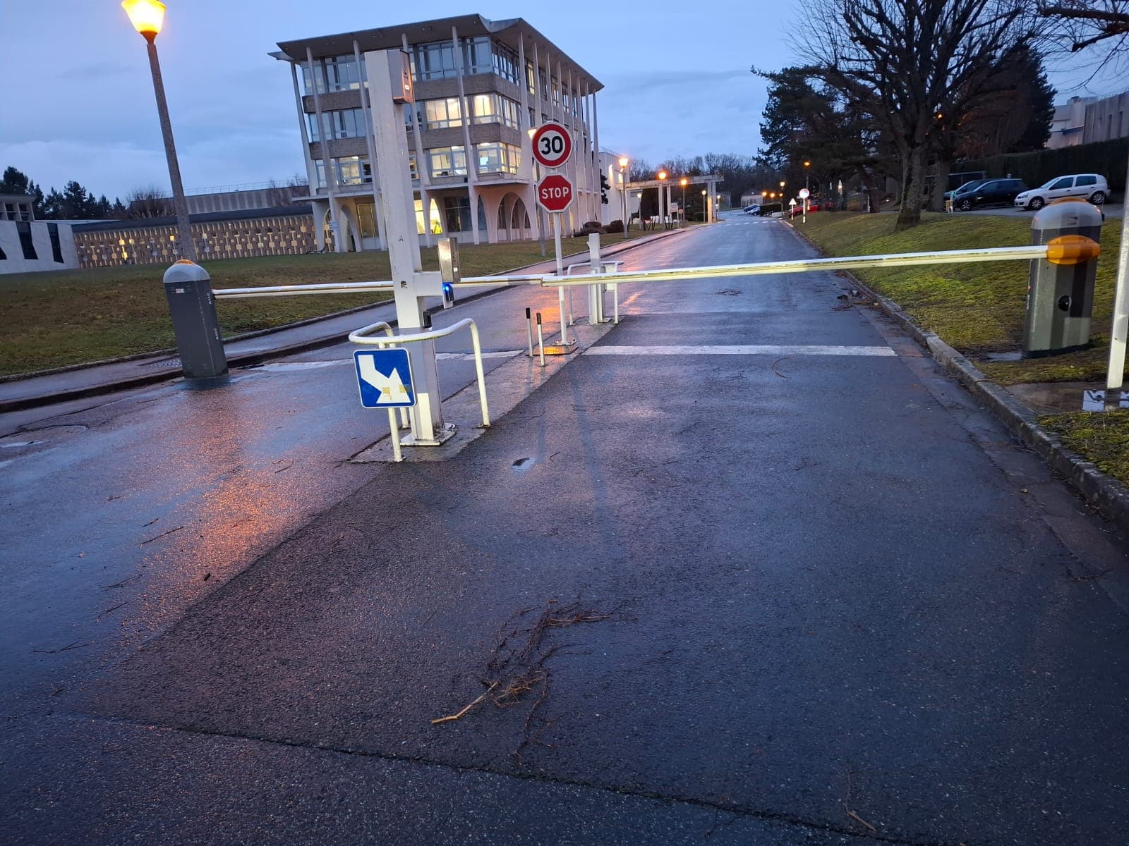 La barrière du parking visiteurs a été utilisée pour remplacer celle qui avait été percutée, rétablissant ainsi l'homogénéité et la sécurité du flux principal. Dans la foulée et pour parfaire l'installation, une barrière neuve de haute performance des établissements Roger Technology a été posée sur l'accès visiteurs.